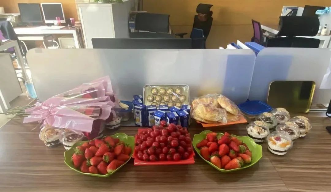 “一束鮮花獻(xiàn)真情,一張禮卡表祝福”,還有心靈手巧的女同事親手做的甜品蛋糕投喂。